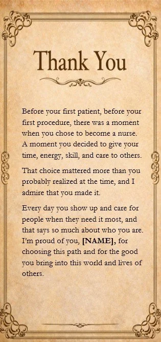 Each chapter includes a short note you can easily personalize for your nurse. The note connects to that day’s chapter and lets you thank them for moments every nurse goes through, but no one was there to thank them for at the time. For many nurses, hearing those words for what they thought nobody noticed, or what they had quietly been carrying, can mean more than you might expect, and make the week incredibly special.
